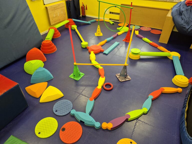 In unserer Praxis erleben Kinder Therapie ganz anders: als spannendes Abenteuer! Mit kreativen Bewegungsparcours aus bunten „Flusssteinen“, Stangen und Reifen fördern wir spielerisch die motorischen Fähigkeiten Ihres Kindes. Balancieren, klettern, springen, all das stärkt Gleichgewicht, Koordination und Körperwahrnehmung.